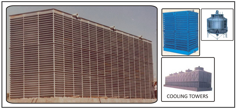 The Cooling Towers are manufactured using FRP, wooden, hot dip galvanized SS or carbon steel material. Honey comb type fills or wooden flat type fills or triangular type fills or perforated angle type PVC.